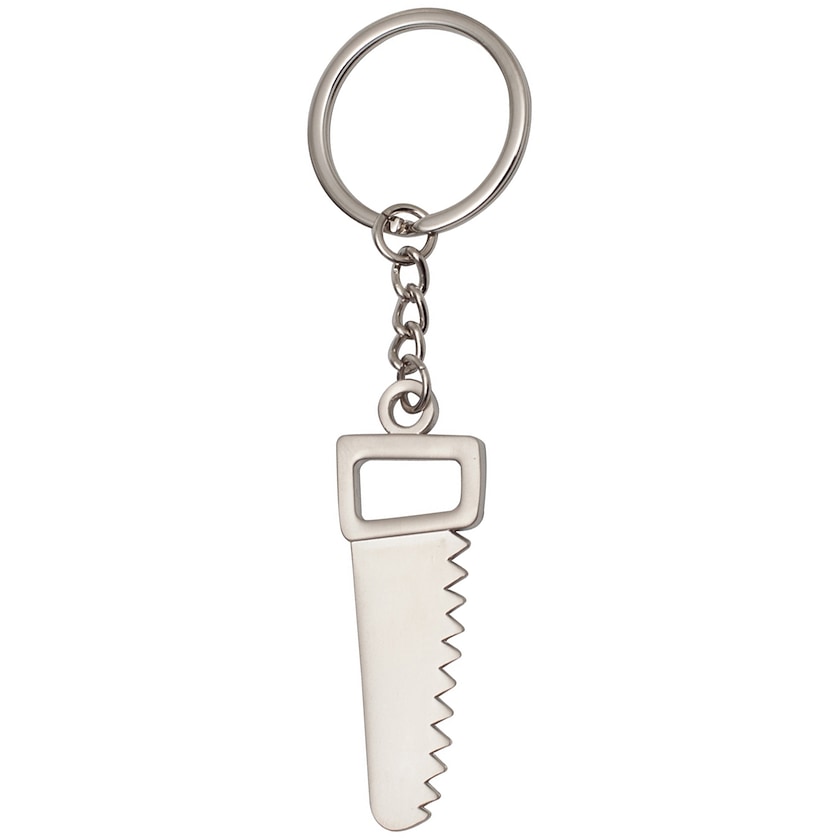 Metallinen avaimeperä sahan muotoisena. Tuote on pakattu pieneen lahjarasiaan.