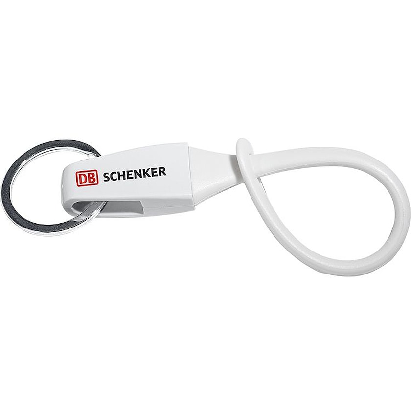 Avaimenperä, jossa rannelenkki silikonista. Painatus tehdään avaimenperän muoviosaan.