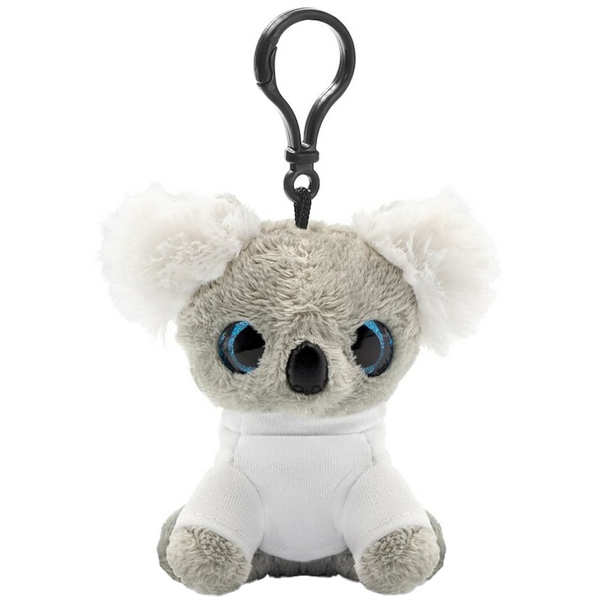 Söpö koala valkoisella t-paidalla ja mustasta muovista tehdyllä koukulla. Koukku tekee siitä täydellisen kiinnitettäväksi esimerkiksi laukkuun tai reppuun.