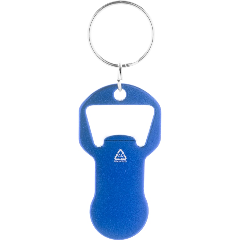 Pullonavaaja, jossa on Euro-ostoskärryraha. Steven on valmistettu kierrätetystä alumiinista. Merkintä tehdään laserkaiverruksella.