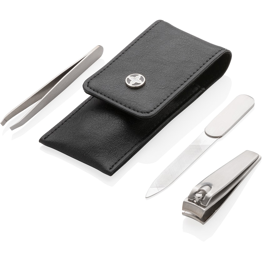 Pieni manikyyrisetti merkiltä Swiss Peak. Setti sisältää kolme osaa, jotka on valmistettu ruostumattomasta teräksestä. Merkkaus tehdään kaiverruksena keinonahkakoteloon.