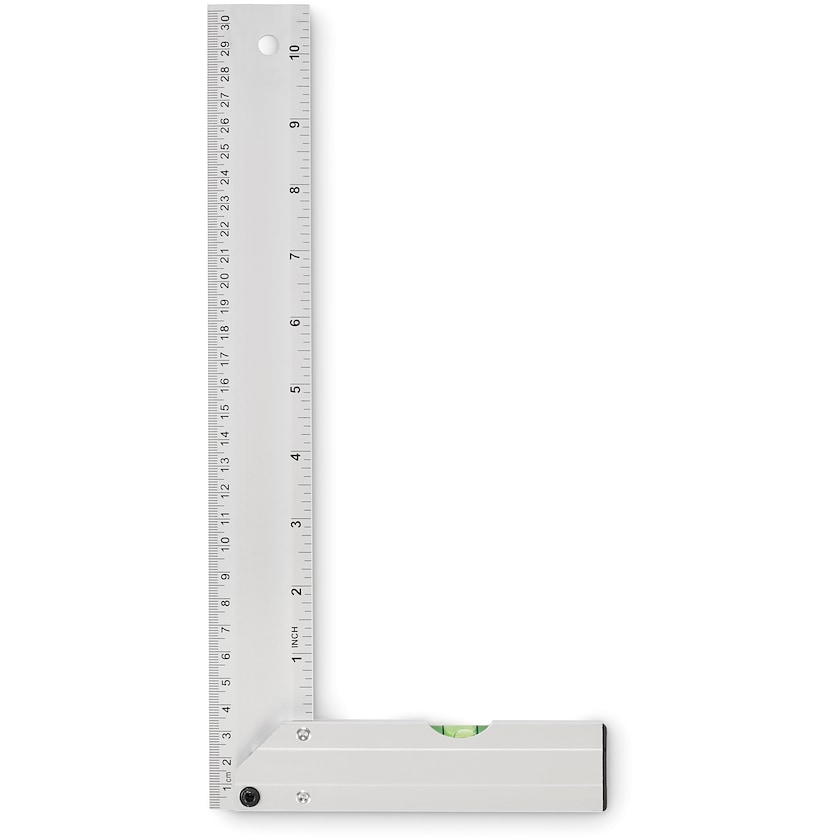 Alumiininen suorakulma vatupassilla. Merkintä voidaan tehdä joko painatuksella tai laserkaiverruksella.
