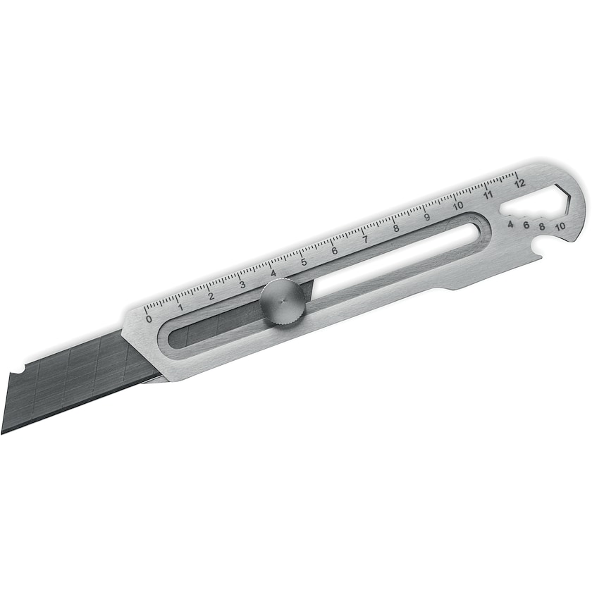 Ruostumattomasta teräksestä valmistettu mattoveitsi hiiliteräksisellä terällä. Veitsi ei toimi ainoastaan veitsenä, vaan myös pullonavaajana, jakoavaimena ja viivottimena.