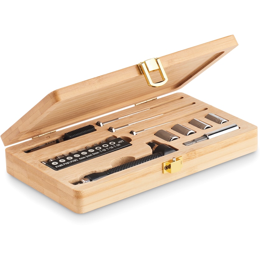 Edullinen työkalusetti. Setti sisältää kotinikkaroijan tärkeimmät välineet. Työkalulaatikko on valmistettu bambusta.