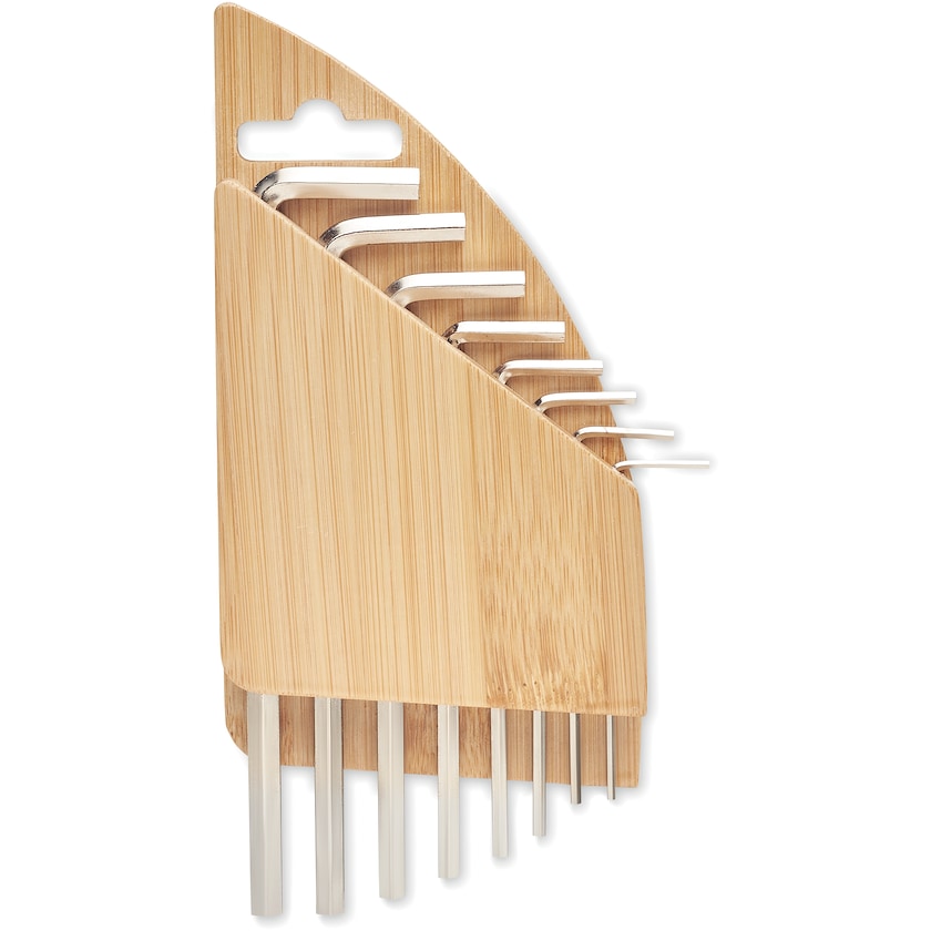 8 kuusiokoloavaimen setti. Työkalut säilytetään kätevässä bambukotelossa. Merkkaus painatuksena tai laserkaiverruksena. Täydellinen setti joka kotiin!