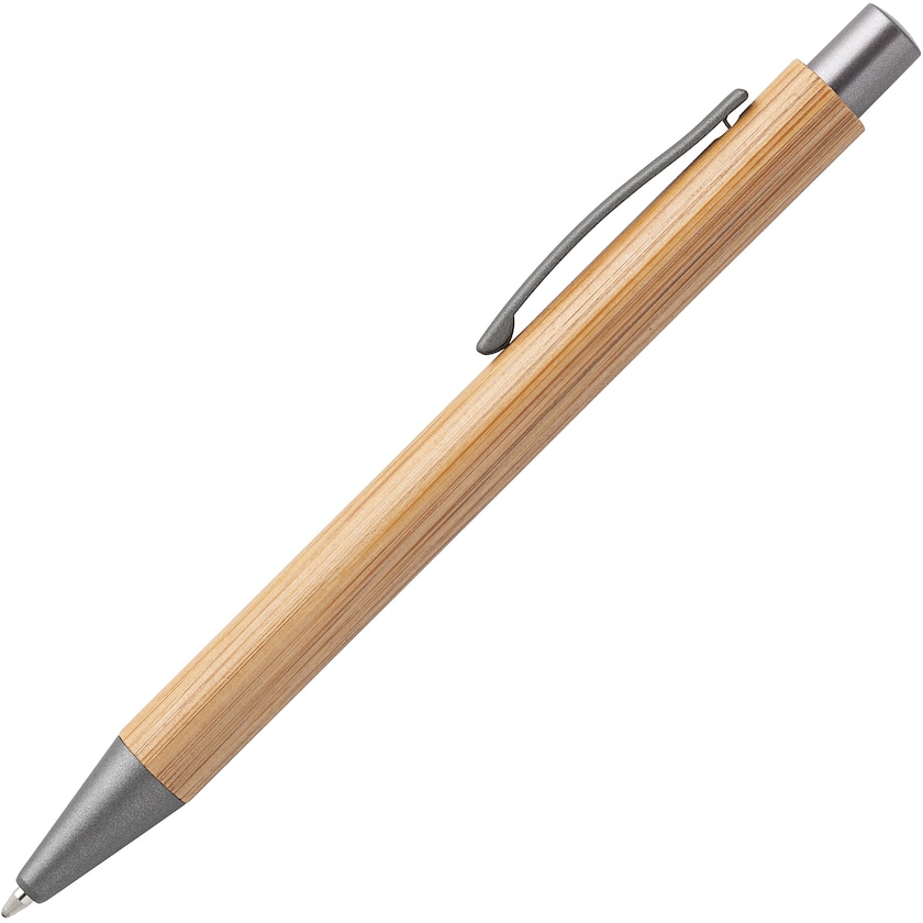 Tyylikäs bambusta ja metallista valmistettu kynä. Mustepatruunassa on sininen muste.