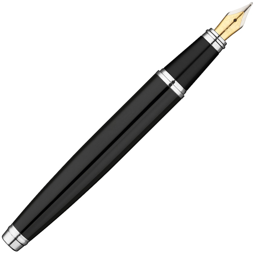 Ylellinen täytekynä korkilla. Musta runko ja kromatut yksityiskohdat. Tilaa täytekynät painatuksella Axon Profililta!