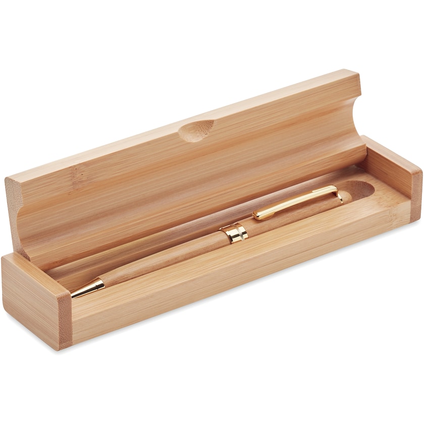 Ylellinen kynä kullanvärisillä metalliosilla ja bamburungolla. Kynät toimitetaan upeissa bamburasioissa. Merkkauksen voi valita joko kynään tai lahjarasiaan.