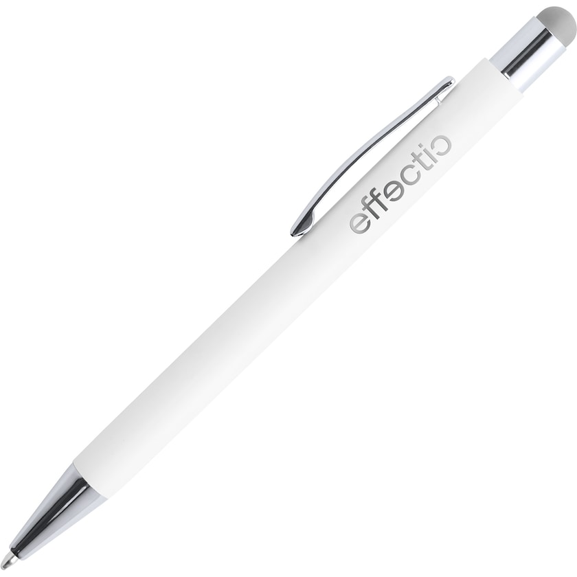Valkoinen kosketuskynä värillisellä laserkaiverruksella. Kun kynä on laserkaiverrettu, kuvio näkyy samanvärisenä kuin kynän kosketuspää. Kynä on valmistettu alumiinista ja siinä on sininen mustepatruuna.
