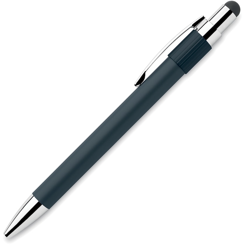 Kosketuskynä jonka yläosassa on stressinlievittävä spinneri. Britton on valmistettu alumiinista ja siinä on sininen muste.