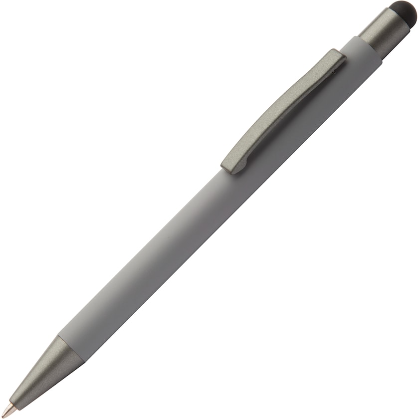 Alumiininen kosketuskynä kumipäällysteisellä pinnalla. Kumipintainen kynä on miellyttävä kädessä. Kustomointi laserkaiverruksena.