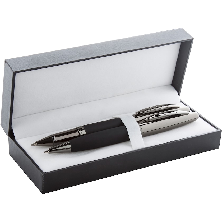 Tyylikäs kynäsetti muste- ja kuulakärkikynällä. Kynissä kiiltävä, tumma gunmetal-sävyinen metallipinta ja pehmeä kumimainen grip-kärki. Sininen muste. Kyniin voidaan tehdä kustomoitu laserkaiverrus tai painatus 1-4:llä Pantone-kartan sävyllä. Yhden painatuksen tai kaiverruksen hinta koskee yhtä kynää.