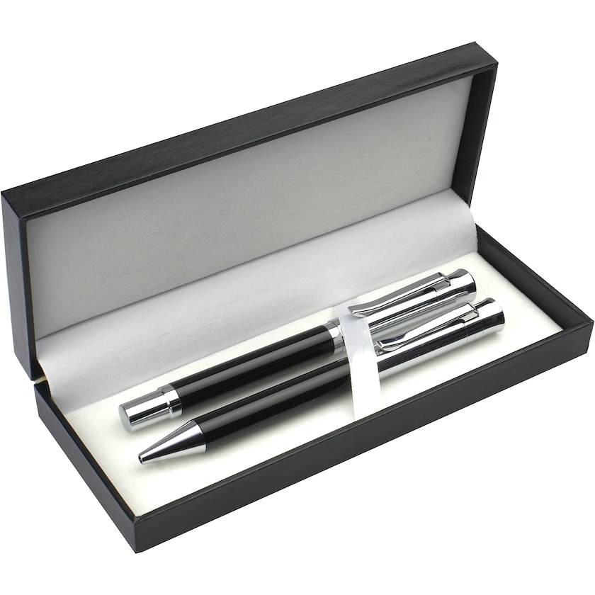 Setti metallikynillä, joissa kromi kiiltää . Kyniin tehdään merkkaus laserkaiverruksena ja tekonahkakantiseen lahjalaatikkoon painatuksena. Laserkaiverruksen hinta tarkoittaa kaiverrusta yhteen kynään.