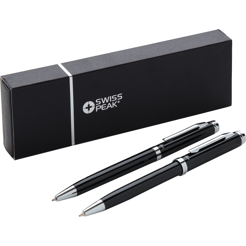 Kahden metallikynän setti merkiltä Swiss Peak. Kynäsetti sisältää kuulakärkikynän sinisellä musteella sekä lyijytäytekynän 0.7 mm terällä. Mustekynässä on saksalainen mustepatruuna, jolla voi kirjoittaa jopa 1200 m. Merkkaushinta sisältää painatuksen tai laserkaiverruksen yhteen kynistä.