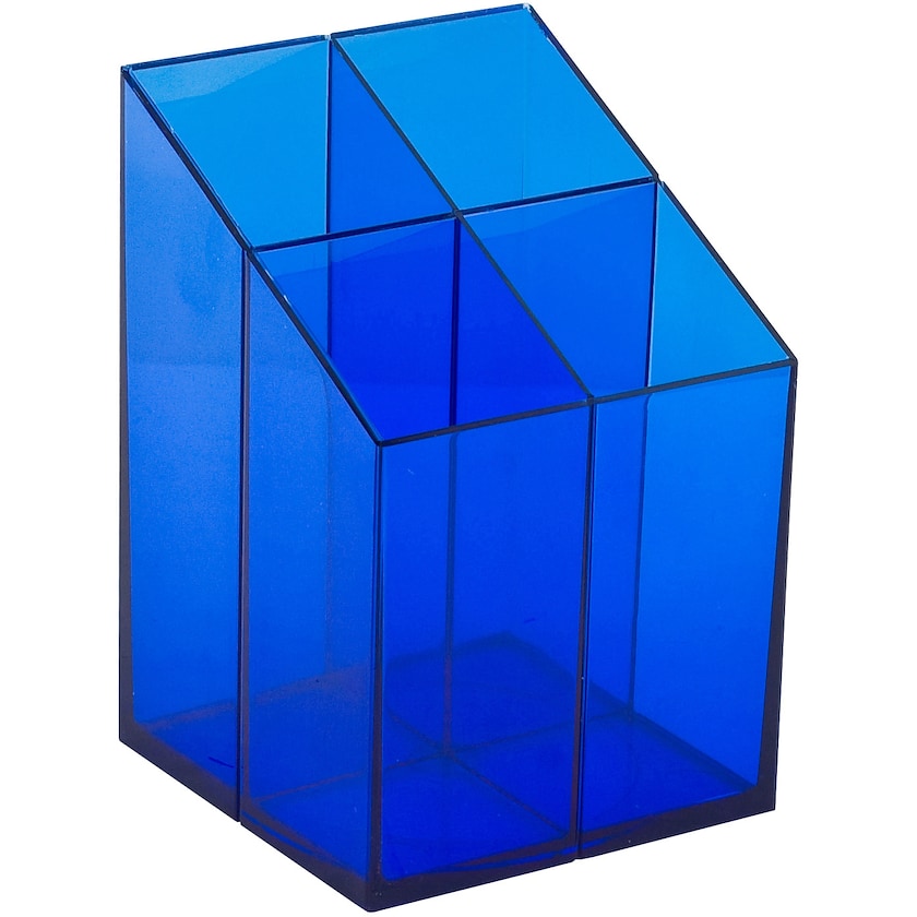 Läpinäkyvästä muovista valmistettu kynäteline. Tähän kynäpurkkiin saat kätevästi järjestettyä pitkät ja lyhyet kynät.