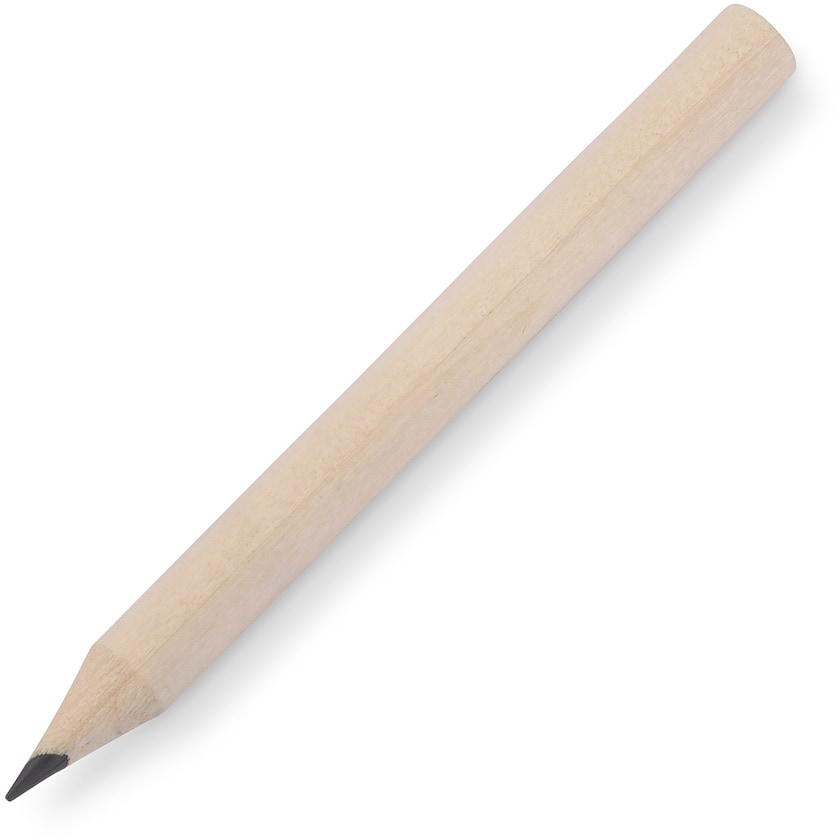 Lyhyt lyijykynä painatuksella. Kynä on luonnonvärinen ja sen pituus on 85 mm. Toimitetaan teroitettuna.