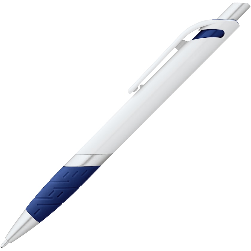 Mainoskynä kumigripillä ja hopeanvärisillä yksityiskohdilla. Dove-kynässä on moderni muotoilu, ja grippiin sointuva tehosteväri kynän yläosassa. Kynässä on sininen mustepatruuna.