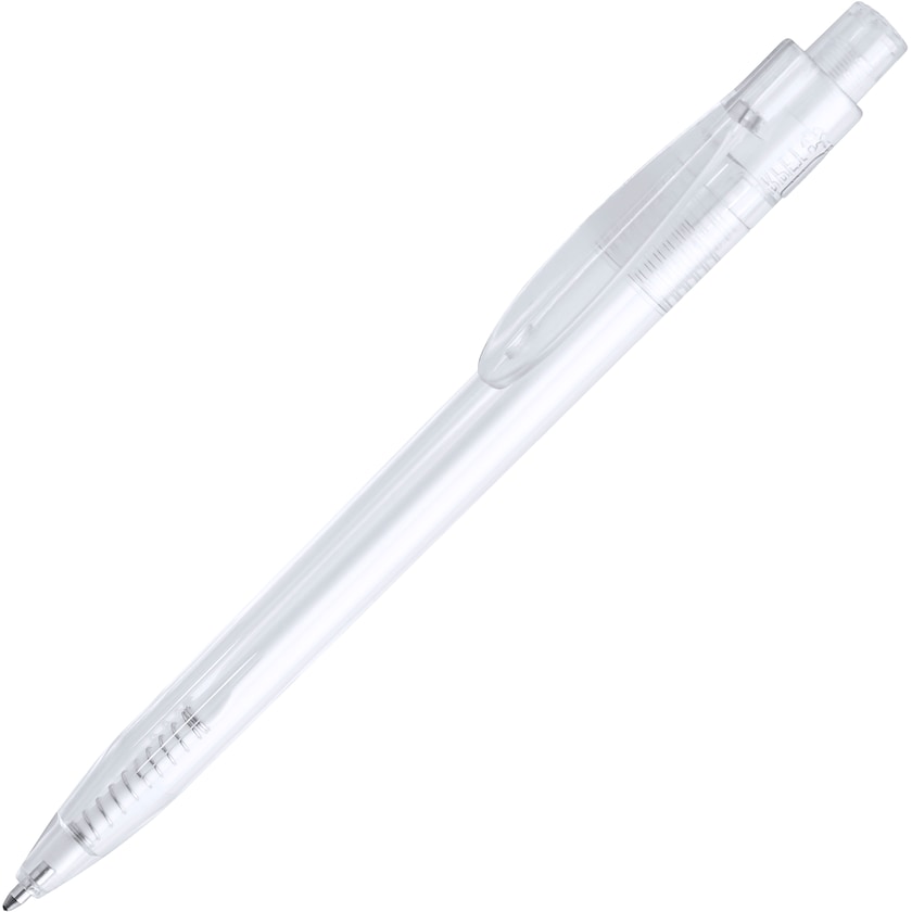 Edullinen mainoskynä ympäristöystävällisestä rPETistä. Kynässä on sininen muste. Kynän materiaali on tuotettu kierrätetyistä PET-muovipulloista.