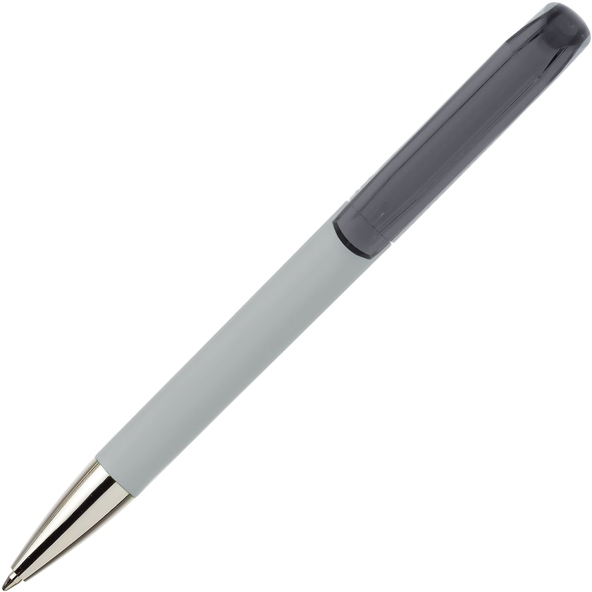 Korkealaatuinen kumipintainen mainoskynä. Kynässä on metallinen kärki ja läpinäkyvä muoviklipsi, johon painatus tehdään.