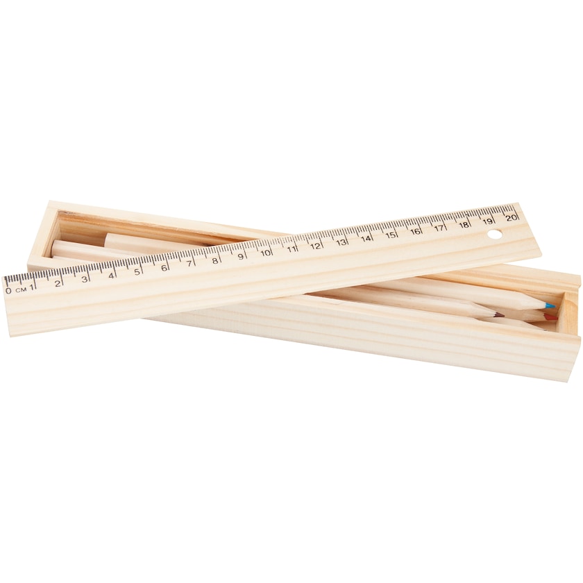 Setti, jossa 6 värikynää ja viivain. Viivain toimii kantena ja viivaimeen tehdään myös painatus.