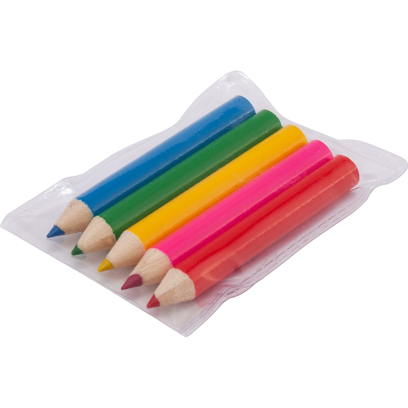 Pieni 5 värikynän setti. Kynät on pakattu läpinäkyvään pakkaukseen, johon saa digipainatuksen.