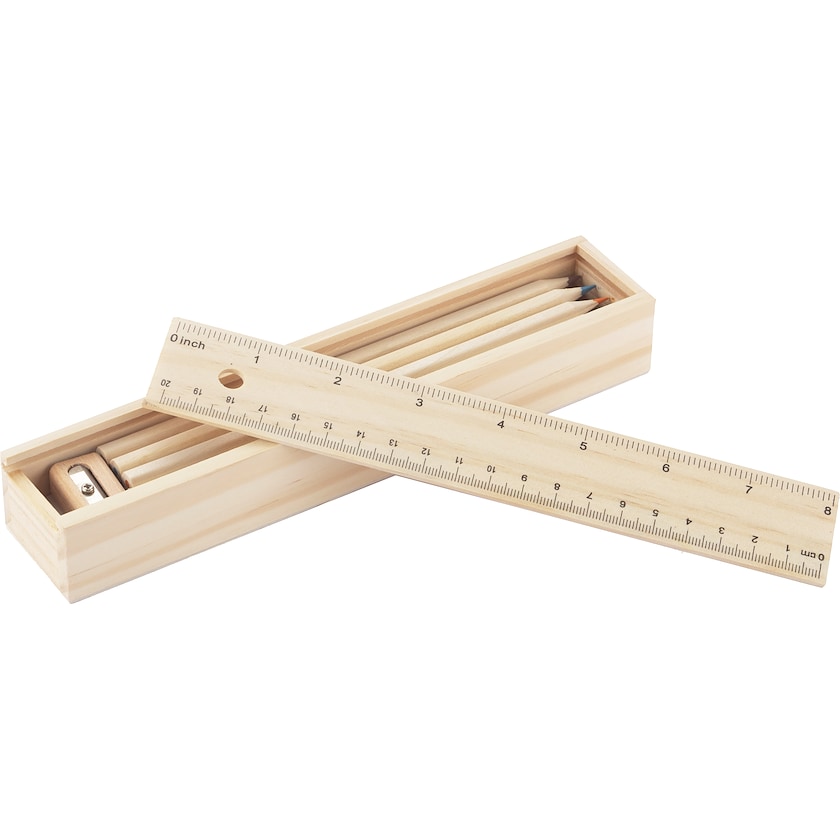 Setti, jossa 12 värikynää, viivain ja pyyhekumi. Merkkaus tehdään viivaimeen.
