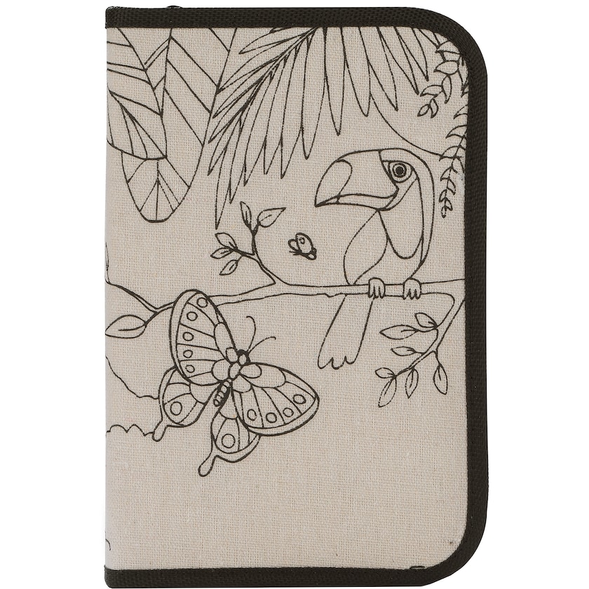 Puuvillainen kotelo sisältää värikyniä, teroittimen, pyyhekumin sekä lehtiön. Piirrustuslehtiössä on tyhjiä sivuja ja väritystehtäviä. Värikynät toimitetaan teroittamattomina. Hauska mainoslahja, josta riittää iloa pitkäksi aikaa!