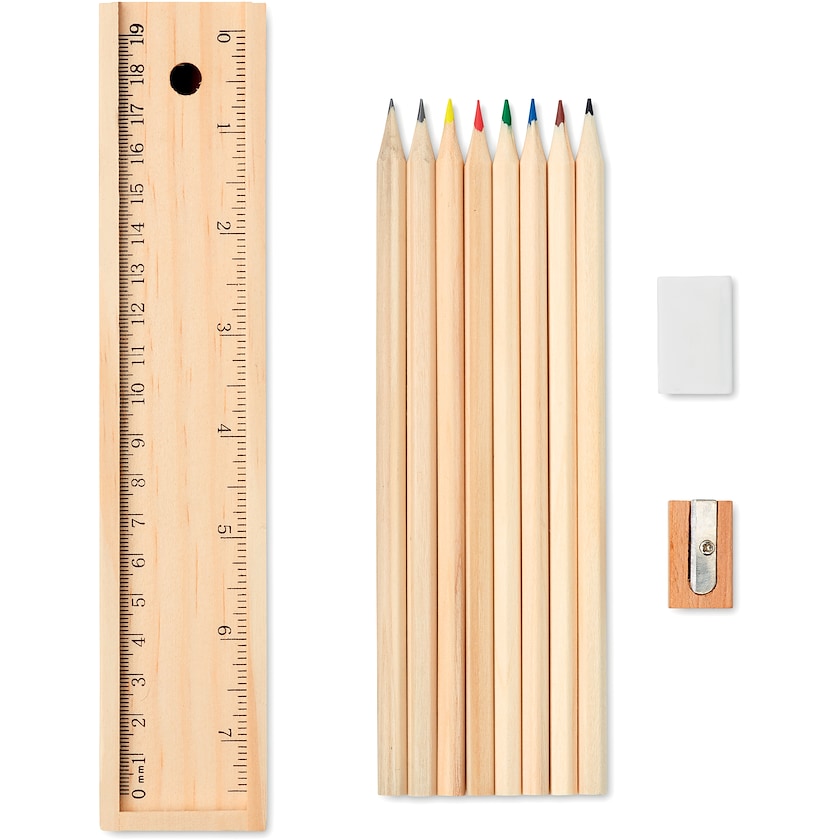 Värikynäsetti puisessa rasiassa. Setti sisältää 2 lyijykynää, 6 värikynää, 1 teroittimen, 1 pyyhekumin sekä 1 viivaimen. Viivain toimii myös puurasian kantena.