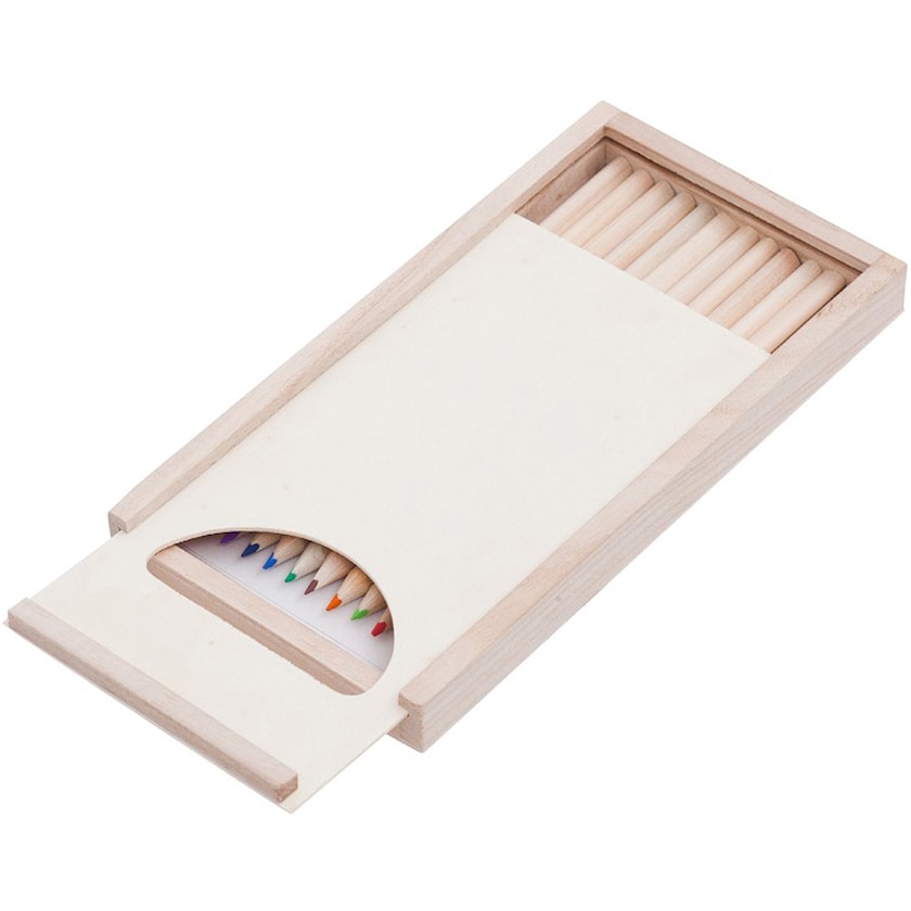 12 värikynän ja 6 värityssivun setti. Tuotteet toimitetaan sievässä puulaatikossa. Painatus tehdään laatikkoon.