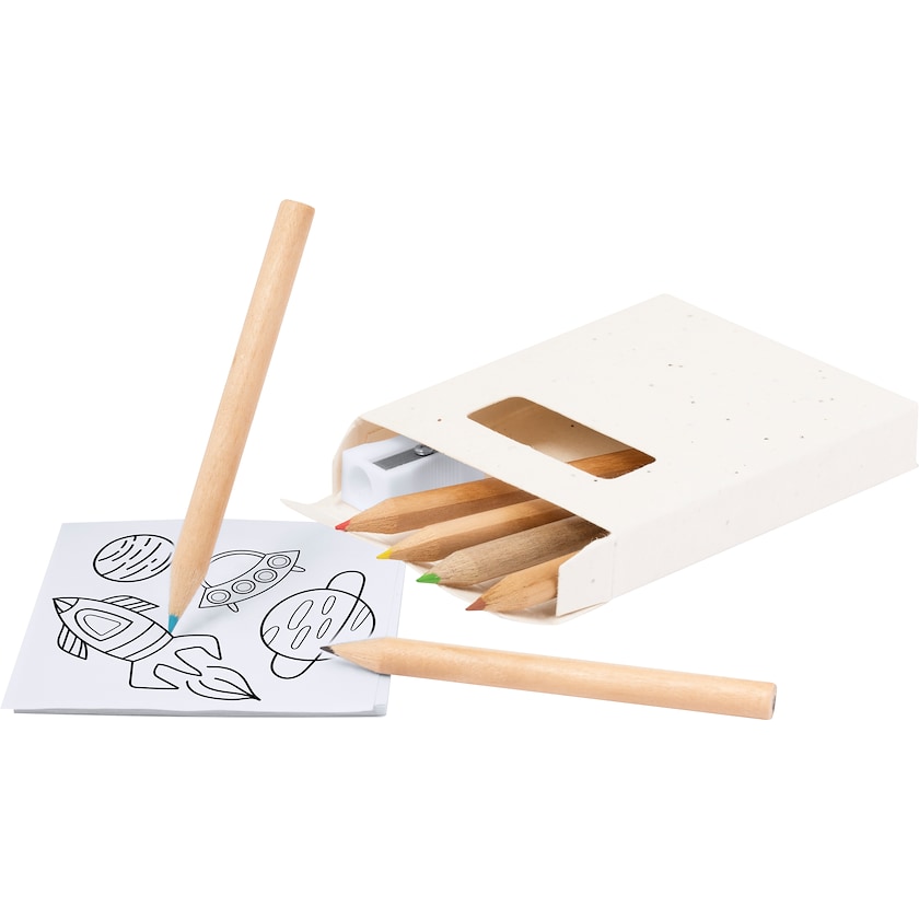 Värikynät, teroitin ja piirustuslehtiö siemenpaperipakkauksessa. Piirustuslehtiössä on 20 sivua. Pakkauksen voi istuttaa käytön jälkeen ja tuottaa kauniita petunioita.