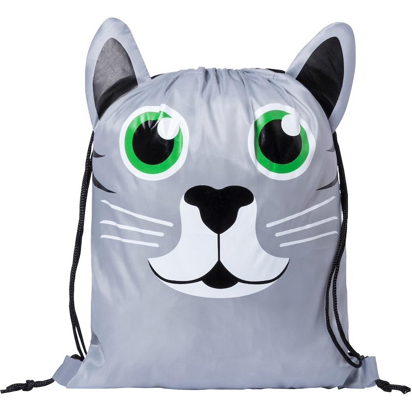 Hauska eläinaiheinen jumppapussi. Pussi on valmistettu polyesterista ja siinä on mustat narut. Eläinkuvioina kissa, sammakko ja elefantti. Lasten suosikki!