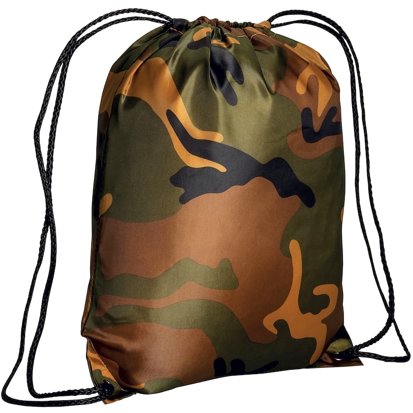 Maastokuvioinen jumppapussi painatuksella. Pussi on valmistettu kestävästä polyesteristä, ja siinä on vahvistetut kulmat. Max 2-väripainatus.