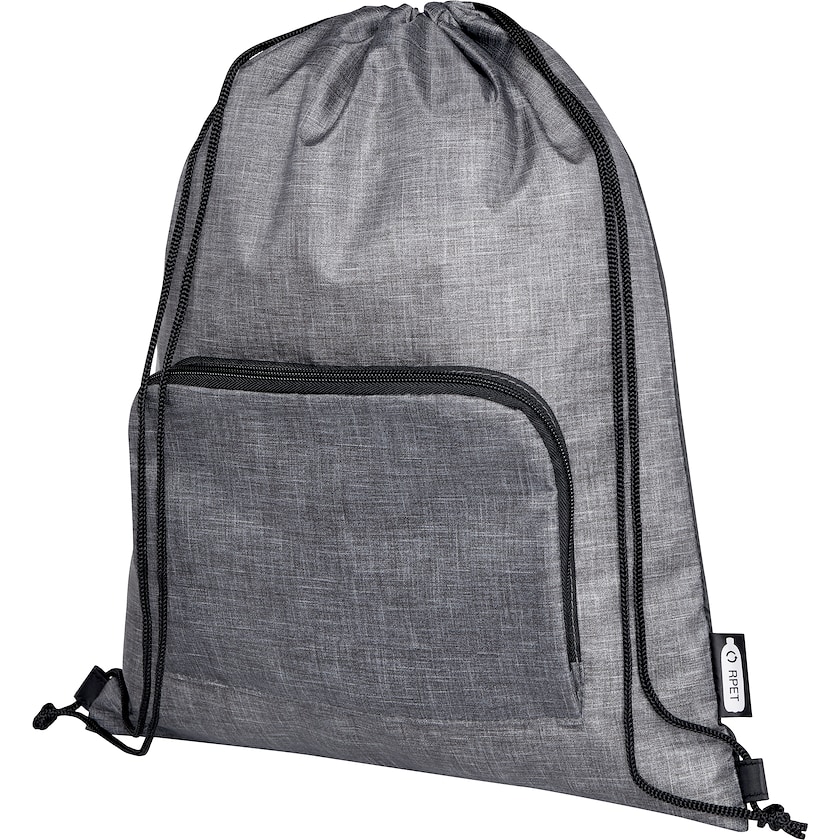 Ympäristöystävällinen ja kokoontaitettava jumppapussi. Nilo on valmistettu kierrätetystä polyesteristä. Sen etupuolella on vetoketjutasku, jonka sisälle pussin voi taittaa kokoon, kun se ei ole käytössä.