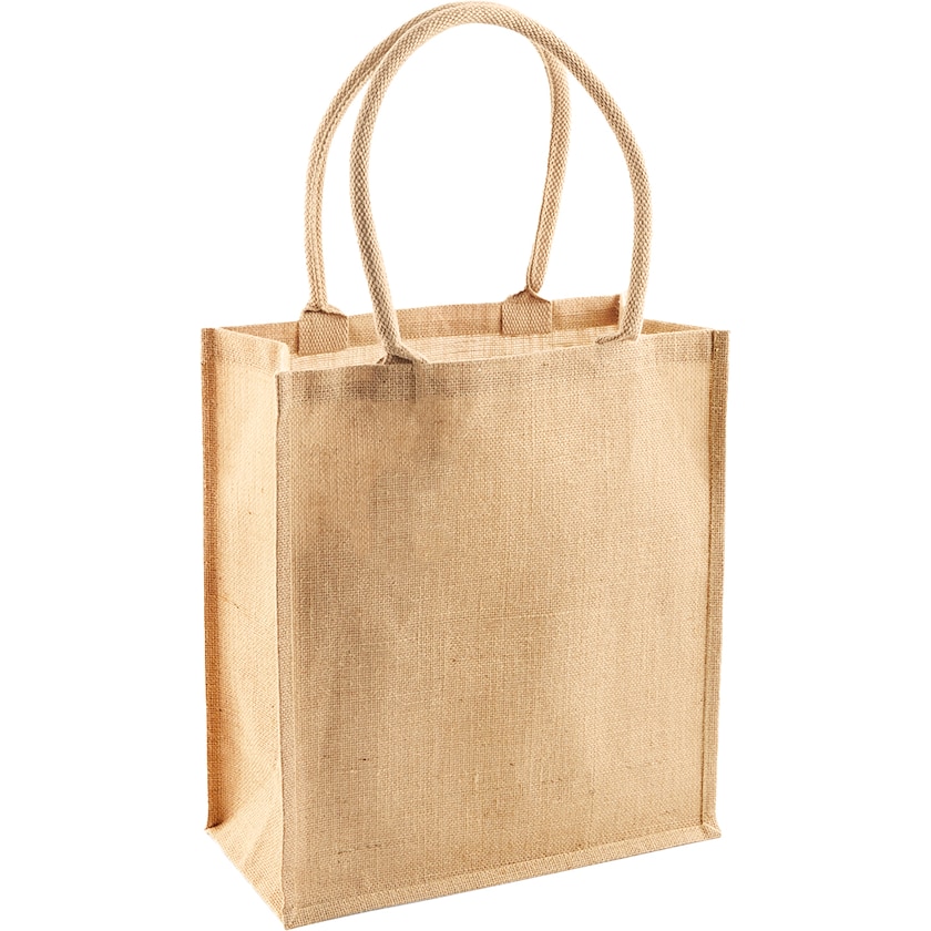 Laminoitu juuttikassi puuvillaisilla kahvoilla. Karkeapintaiseen materiaaliin kannattaa painattaa melko selkeitä kuvioita, joissa ei ole pieniä yksityiskohtia. Painatus maksimissaan kahdella värillä.