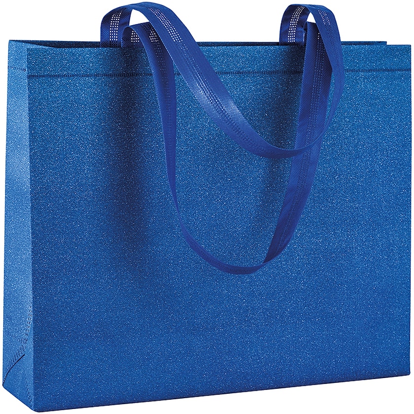 Laminoitu kuitukangaskassi, jossa on kimaltava materiaali. Kassissa on pitkät kahvat ja leveä pohja. Useita värivaihtoehtoja. Glitter on loistava valinta, jos etsit persoonallista mainoslahjaa!