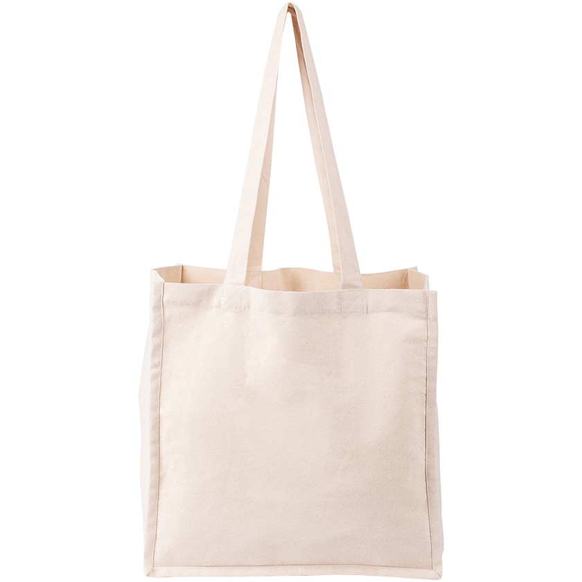 Paksusta puuvillasta valmistettu kassi erittäin leveällä pohjalla. Kassin pohjan leveys on 20,5 cm. Materiaali on 270 g/m² puuvillaa, ja kassin saumat ovat vahvistetut.