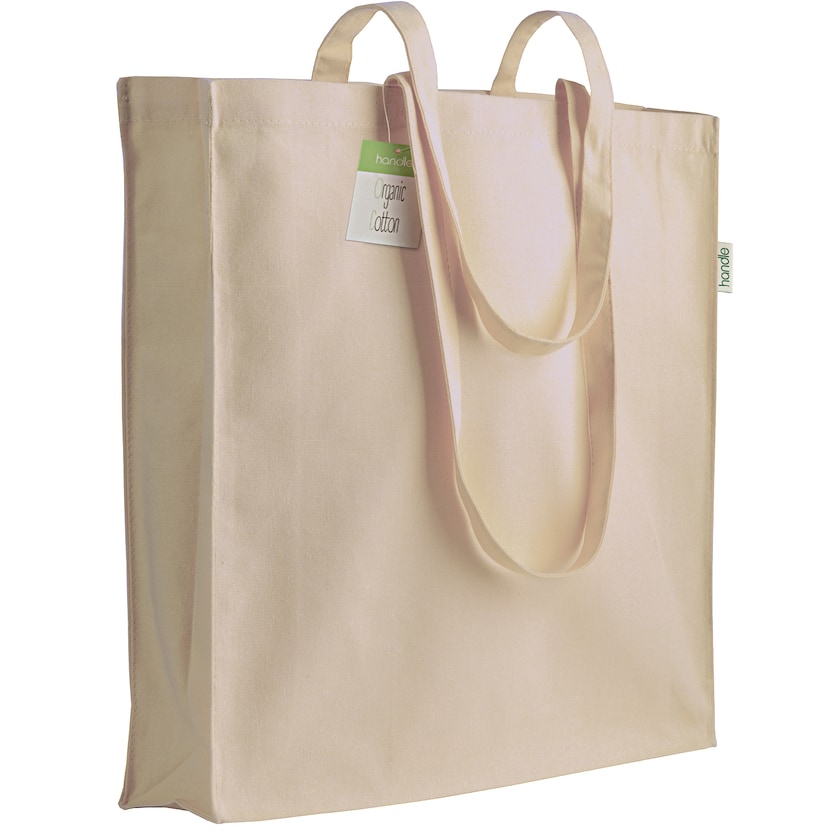 140 gramman kangaskassi leveällä pohjalla. Valmistettu 100 % luomupuuvillasta. Kassin saumassa on pieni Handle-kangasmerkki.