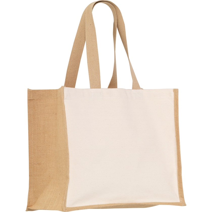 Juutti-puuvillakassi omalla logolla. Kassissa on pitkät kahvat. Laadukas ja kestävä kassi on arvostettu mainoslahja.
