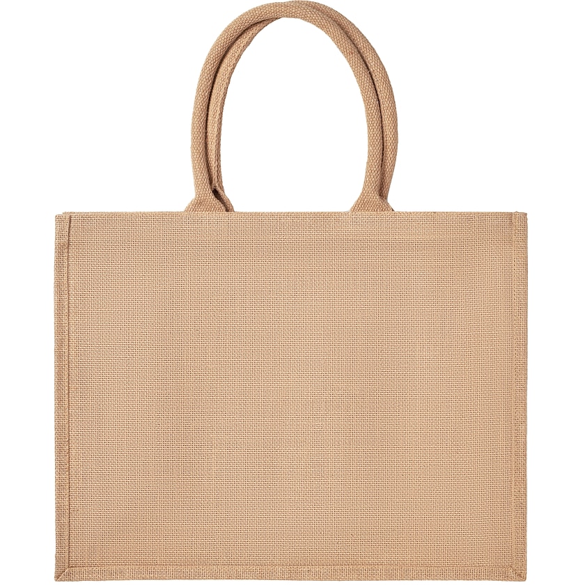 Juuttikassi laminoidulla kankaalla. Laminoinnin ansiosta juuttimateriaali on kestävämpää. Kassissa on lyhyet kahvat ja leveä pohja.