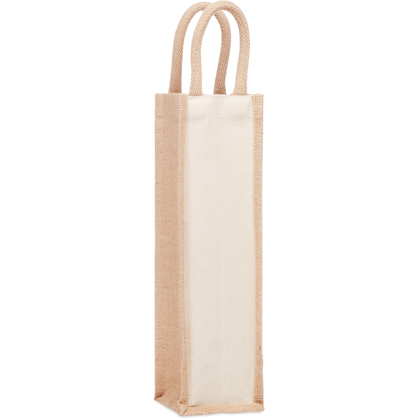 Viinipullokassi , jonka materiaalina on puuvillakanvas ja juutti. Loistava mainostuote, kun haluat antaa lahjaksi hyvän viinipullon. Painatus tehdään kassin puuvillaosaan. Viinipullo ei kuulu hintaan.