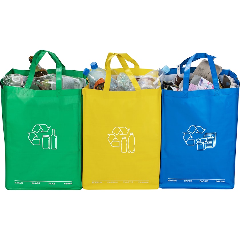 Kolmen muovikassin setti kierrätysmateriaalien järjestämiseen ja säilytykseen. Kassit on valmistettu PP-materiaalista, ja ne on yhdistetty toisiinsa tarranauhalla. Painatushinta koskee yhden kassin painatusta.
