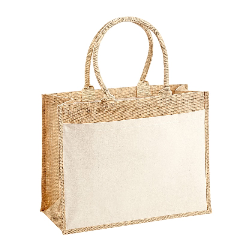 Tilava juuttikassi, jossa on edessä iso puuvillasta tehty tasku. Juuttikangas on laminoitu, joten se on erittäin vahvaa. Laukun kahvat ja tasku on valmistettu luonnonvärisestä puuvillasta. 55 cm pituiset kahvat. Tilava kassi, johon saa isommankin painatuksen.