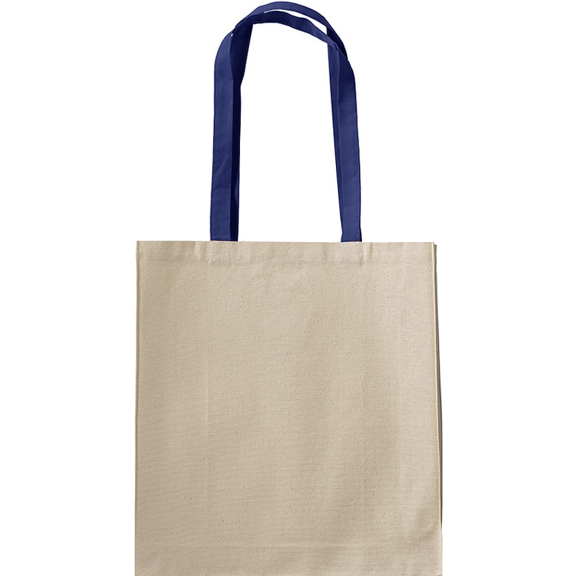 Luonnonvärinen kangaskassi värikkäillä kahvoilla 220 gramman puuvillasta. Pitkät kahvat mahdollistavat kassin kantamisen olalla. Leveäpohjaiseen kassiin mahtuu yllättävän paljon tavaraa.