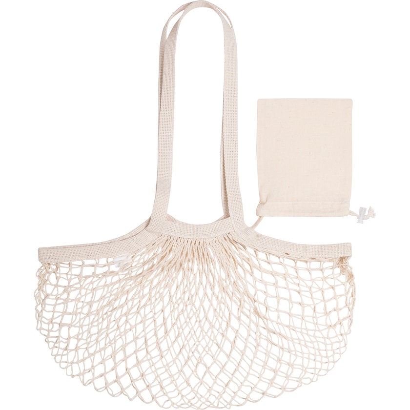 Verkkokassi luonnonvaaleasta puuvillasta. Kassin voi taittaa kokoon mukana tulevaan säilytyspussukkaan. Painatus tehdään säilytyspussiin.