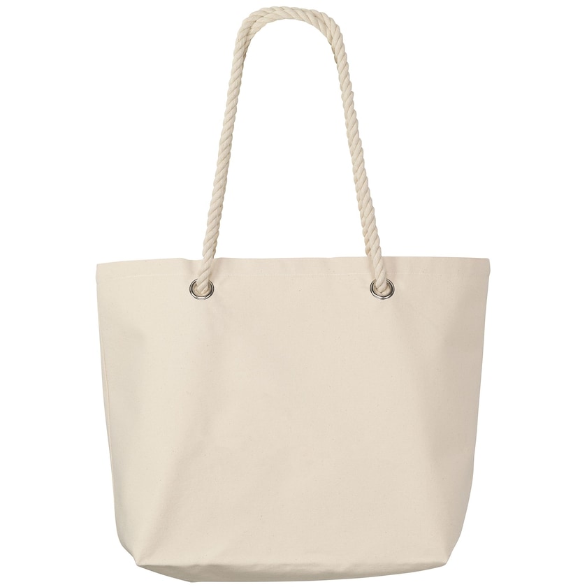 Hieno kassi, jonka kahvat ovat puuvillaköyttä. Laukun sisällä on vetoketjullinen tasku. Loistava kassi rannalle tai ostosreissulle. Merkkaus 1-väripainatuksena.
