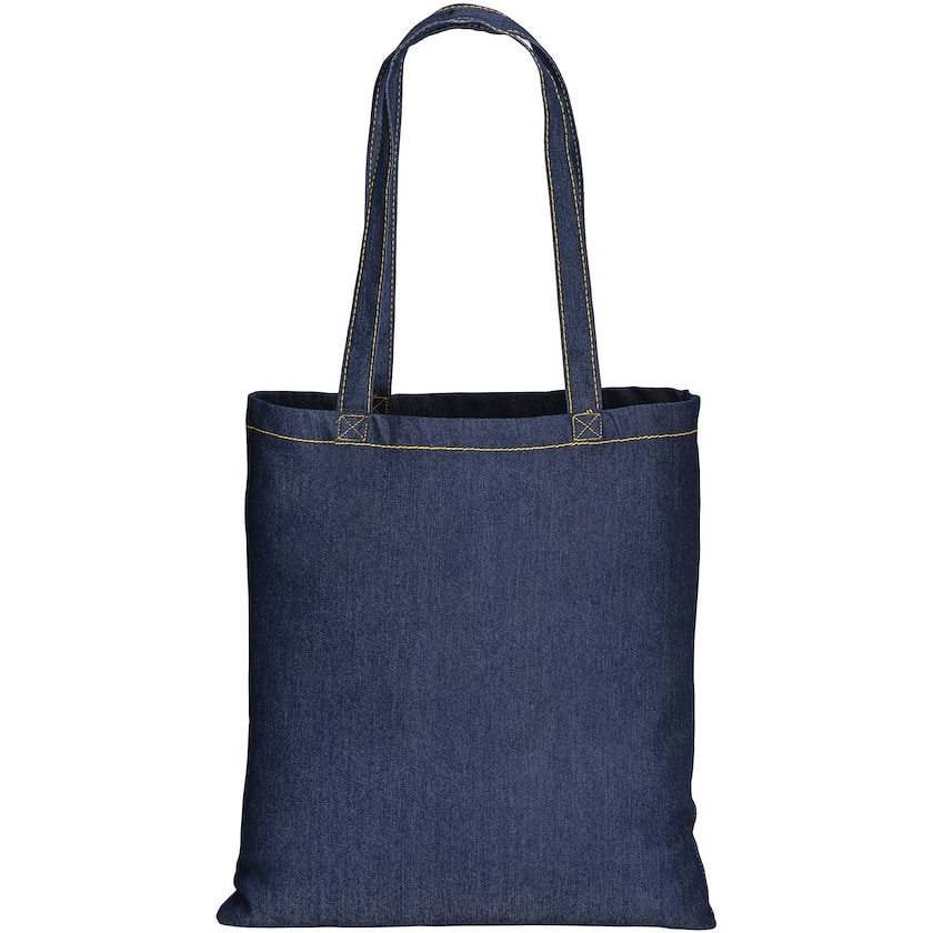 Farkkukankainen kangaskassi kierrätetystä puuvillasta. Denimsininen väri ja keltaiset saumat tekevät tästä mainoskassista persoonallisen.