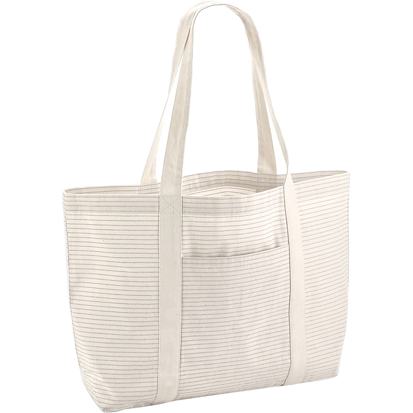 Kaunis puuvillakassi raidallisella kankaalla. Laukku on valmistettu vahvasta 200 gramman kankaasta luomupuuvillaa. Edessä on tilava tasku. Voidaan kantaa olkapäällä tai kädessä.