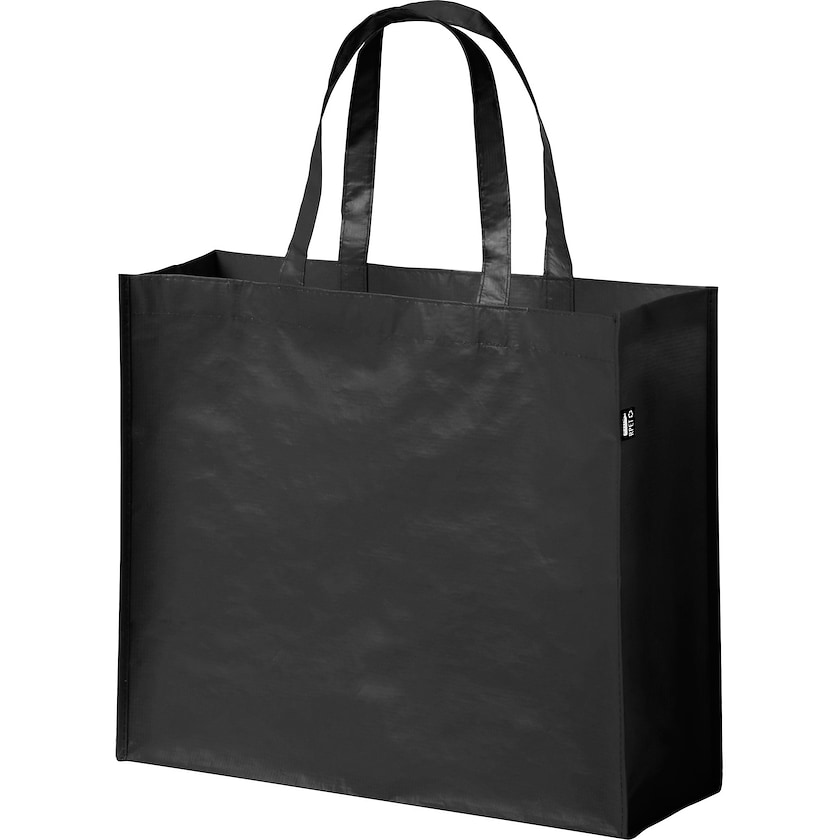 Laminoitu kassi, jonka rPET-materiaali tulee kierrätetyista PET-muovipulloista. Kassin sivussa on etiketti, joka kertoo materiaalin olevan kierrätettyä. Painatus maksimissaan kolmella värillä.