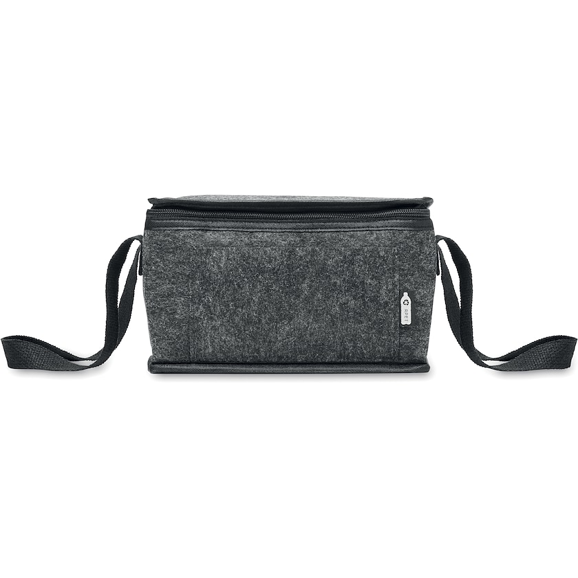 Kierrätetystä huopamateriaalista valmistettu kylmälaukku. Edessä on tasku pienemmille tavaroille.