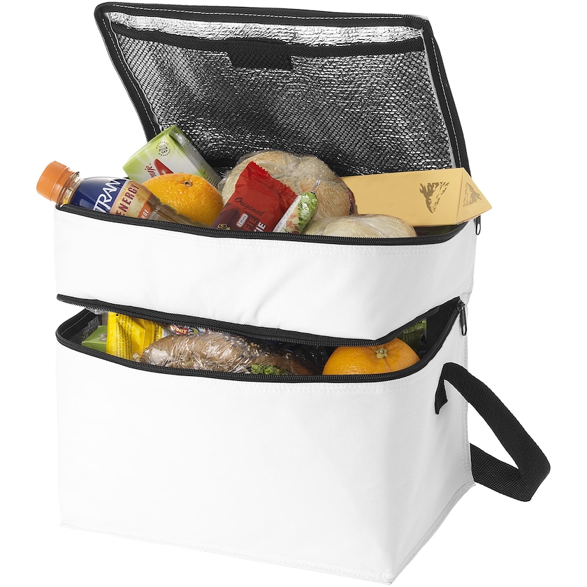 Käytännöllinen kylmälaukku olkahihnalla sekä kahdella suurella taskulla varustettuna. Ylempi lokero sopii mainiosti pienille välipaloille ja muille viilennetyille eväille, kun taas alempi on ihanteellinen isoille kylmässä pidettäville eväille. Olkahihna on säädettävissä.